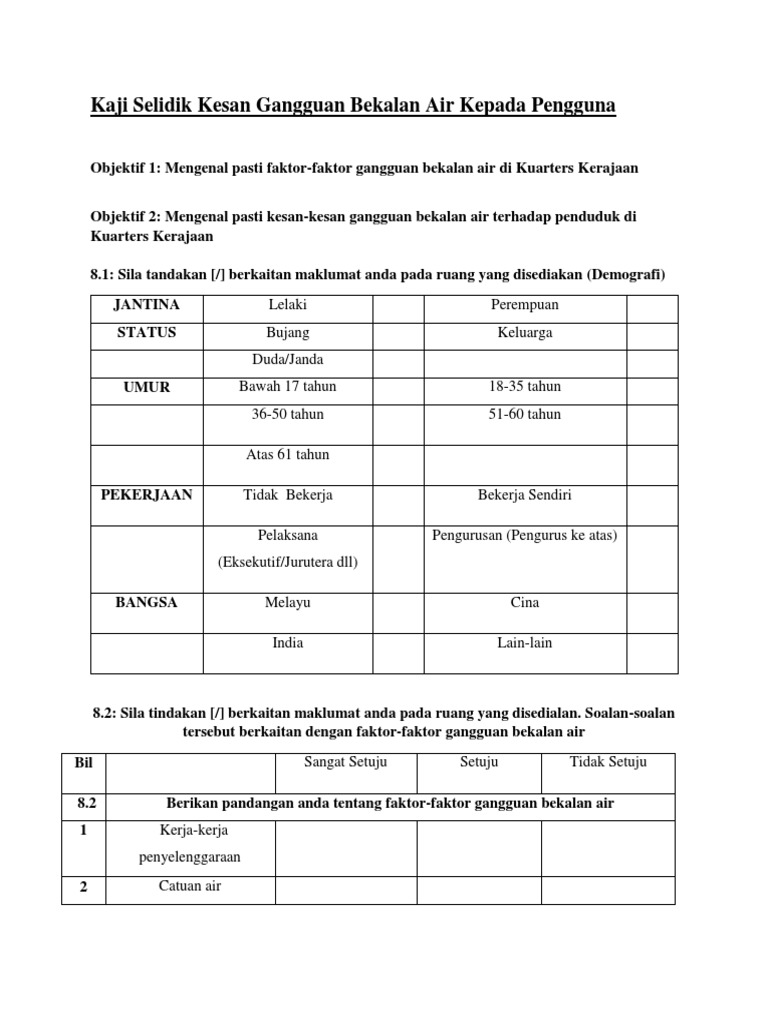 Ini menyebabkan kualiti air yang bersih dari loji rawatan tadi kembali tercemar. Dapatan kajian dapat menunjukkan punca-punca gangguan bekalan air di kawasan kajian dan kesan-kesan akibat gangguan bekalan air kepada penduduk di kawasan kajian. Soal selidik yang telah diubahsuai dilengkapkan oleh responden untuk mencapai objektif pertama.